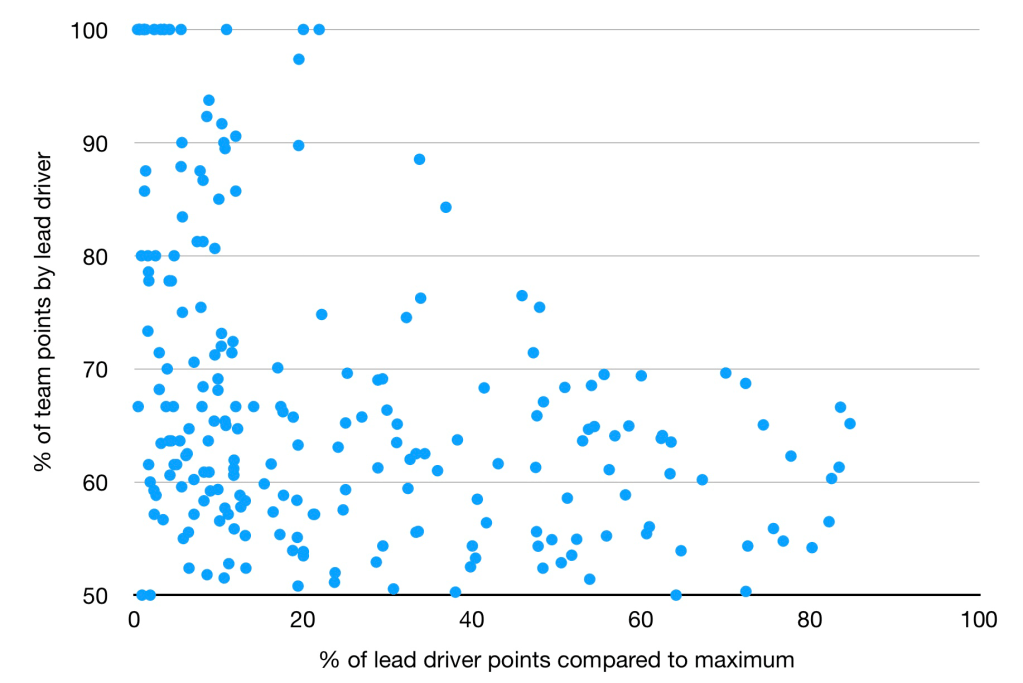- The percentage of the points that two team-mates score relative to each other each year.