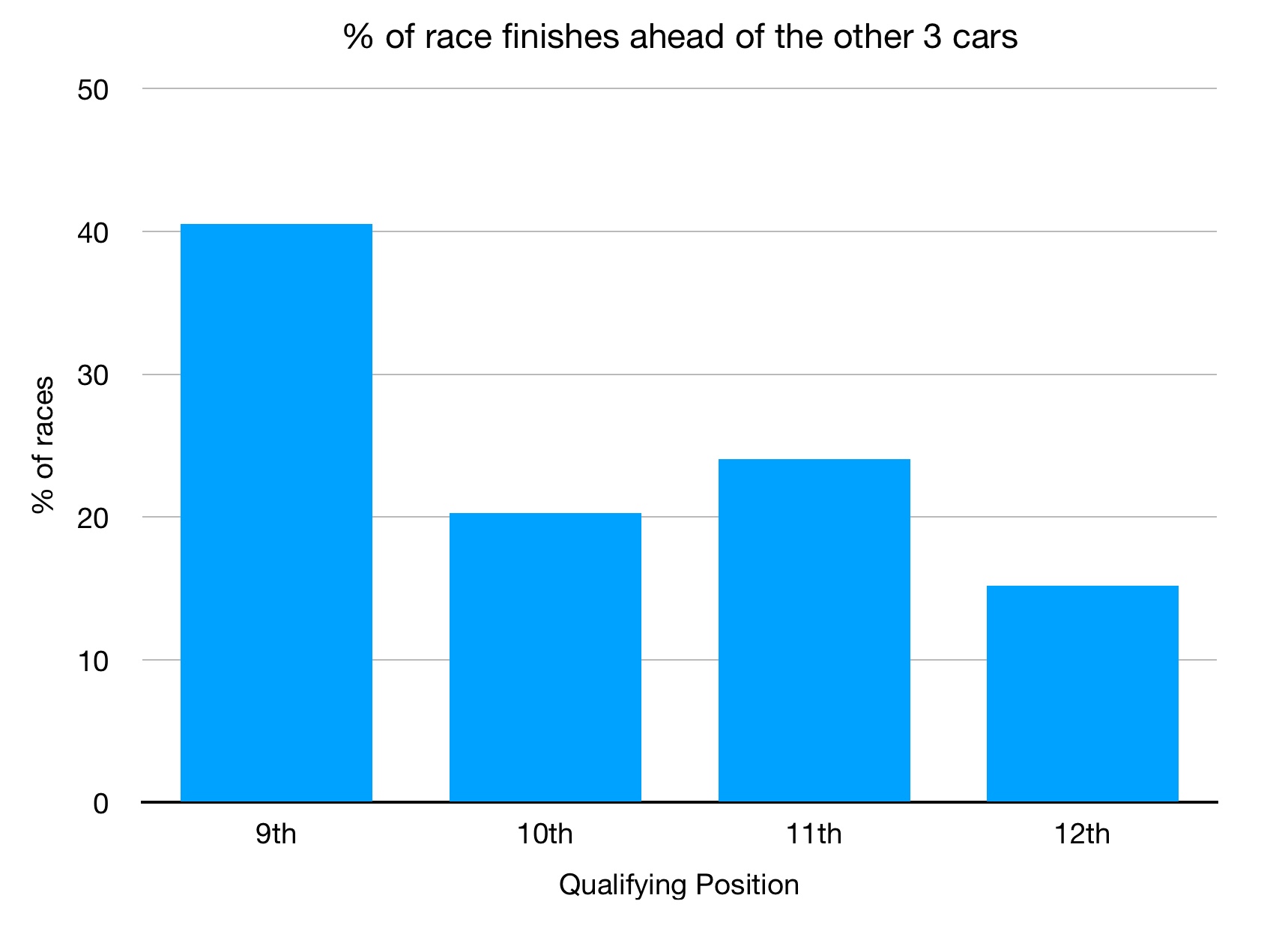 Fig 2: Percentage of races that the qualifying position ended up as the lead car of the four.Another way of measuring success is comparing how often each starting position yields a superior finishing position. This is useful because it is directly comparing the cars we want to compare, without having to worry about the effect of several cars ahead of us retiring, for example. Here 9th is clearly leading again, with 11th slightly ahead of 10th.
