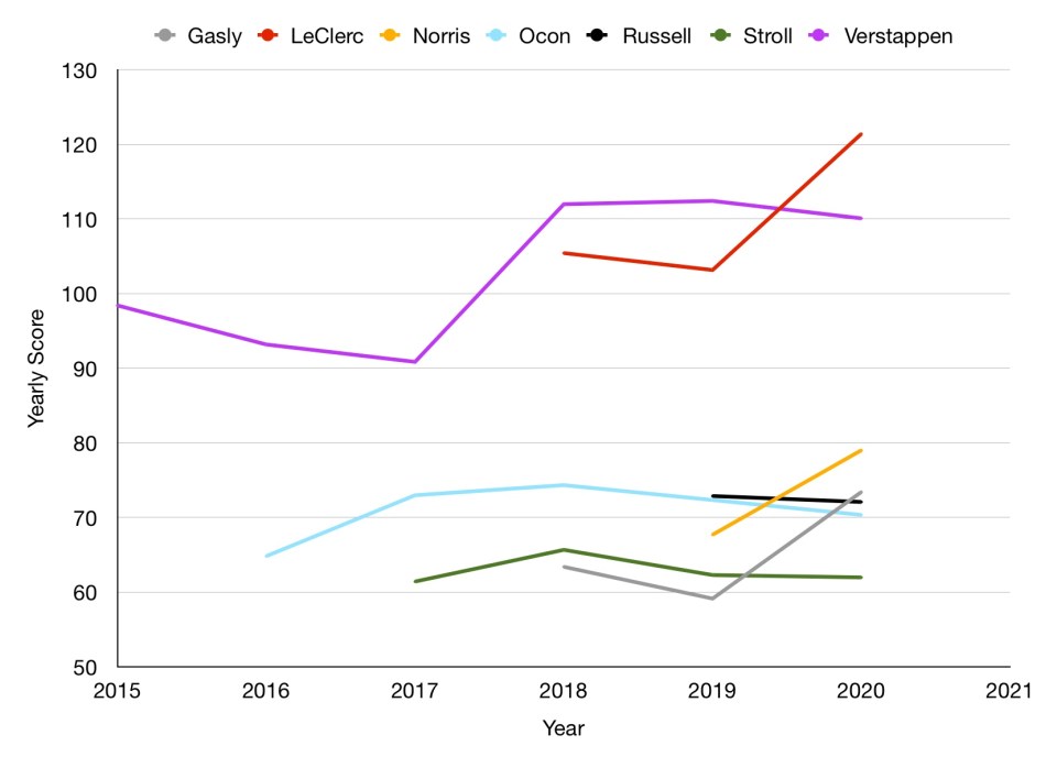 Briefly, the model compares the points (or race finishes when few points are scored) that teammates score every year. It then allows for a comparison of all drivers relative to each other. Typically it takes a few years for a drivers overall ranking to stabilise, and is why all the career reviews looked at so far have been experienced drivers. As we are looking at inexperienced drivers here, this is not a definitive ranking, and should be interpreted more as an analysis of their current level based on the information available. If, for example, Stroll performs very strongly in 2021, then not only would his overall ranking rise, but his ranking for previous years would also rise slightly. In effect the model would assume that Stroll was a stronger driver overall. This would also spill over to his teammates prior to 2021, who would be ranked higher for years where they partnered Stroll. You can learn more about the model here.