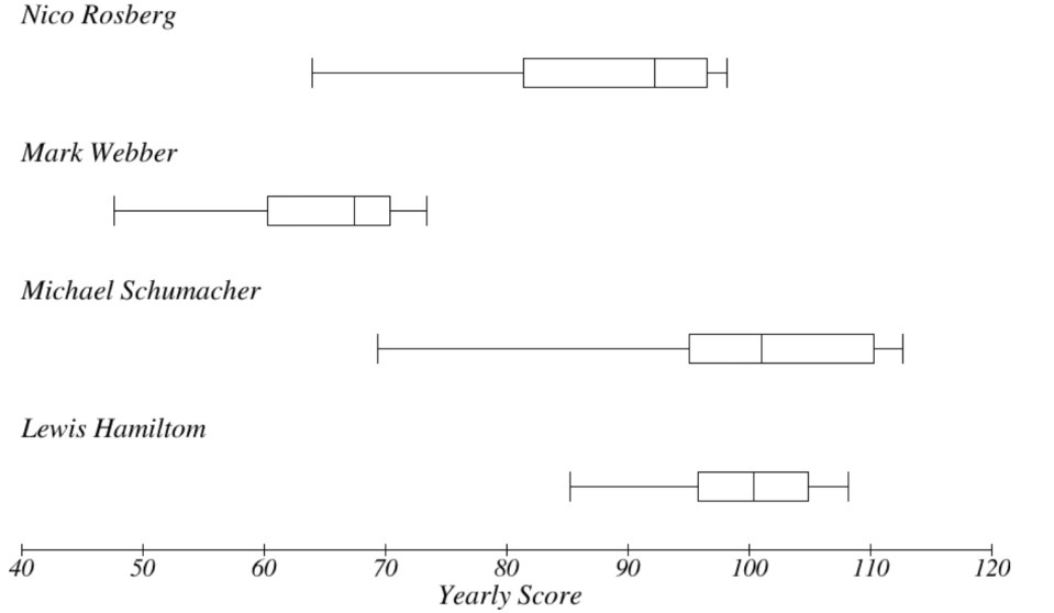 For context, an average year from Hamilton is given a rating of 100. Whilst it’s pretty clear that Rosberg has quite a high peak, you can also see that he has a large amount of variation across his career, with a minimum and a lower quartile significantly below Schumacher and particularly Hamilton.