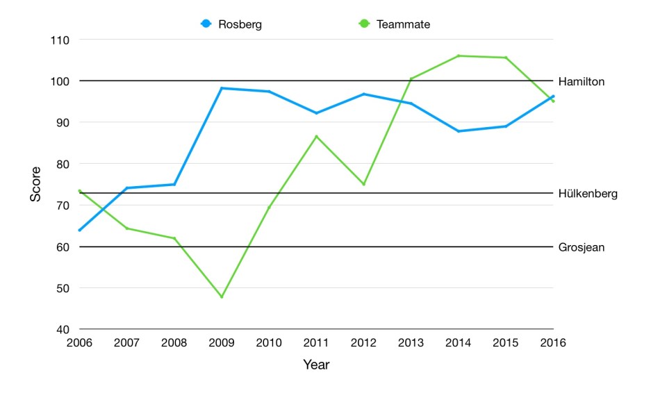 By 2013 Mercedes had a genuinely competitive package, although they suffered from excessive tyre wear. Rosberg also had a new challenge in the form of Lewis Hamilton, and whilst Hamilton had the upper hand more often than not, the pair were much closer than many expected. For 2014 Mercedes were dominant, as they would be for several more years. Rosberg raced Hamilton hard, taking the title to the final round, but ultimately fell short. The slight dip in his score relative to the previous years is mostly explained by reliability issues in the final race of the year; a race that counted for double points.