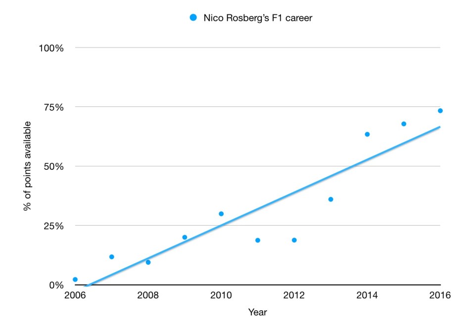 Rosberg’s career is also almost unique in that it only went upwards in terms of results too. Most careers in F1 have peaks and troughs, but take a look at his career progress over time: