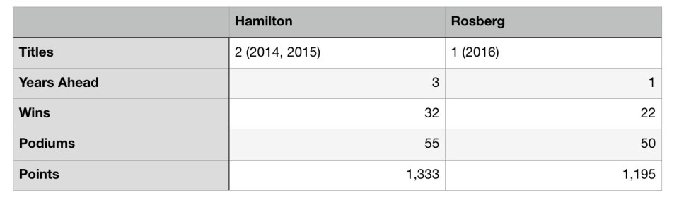 Lastly, let’s look at how he compared to Hamilton over their 4 years together. The stats support the idea that Rosberg was always a whisker behind, but more than capable of putting Hamilton under pressure. This is still an impressive achievement based on what we know of Hamilton’s abilities. Only Jenson Button and Fernando Alonso were so comparatively close to Hamilton as teammates. Given that they are both world champions, Rosberg’s title is probably as deserved as any.