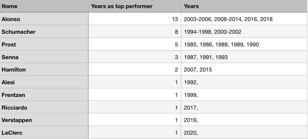 Hamilton: Everyone knows that Hamilton is phenomenally talented, but it’s also clear that he’s had the benefit of superior machinery in recent years. He’s the only rookie top performer, beating Alonso by the slimmest of margins in 2007. Since then he’s always been one of the top performers, but only in 2015 (when Alonso was out scored by his teammate) is he once again considered to have performed the best of everyone. It’s also interesting to note that Hamilton was not considered to be the best driver in either year in which Alonso did not race (2019-2020). This suggests that the young talent in F1 is very good indeed, as Hamilton has hardly off his game in either year.