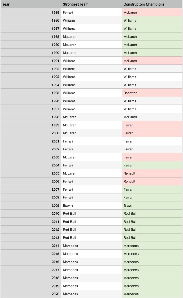 F1 is, at its core, a sport that combines the efforts of drivers and their teams. It is possible to separate the two using a mathematical approach. Here we’ll look at championships from 1985 and compare the actual results with driver’s performances. (This seemingly arbitrary cut off date is because data from earlier is still being analysed.)