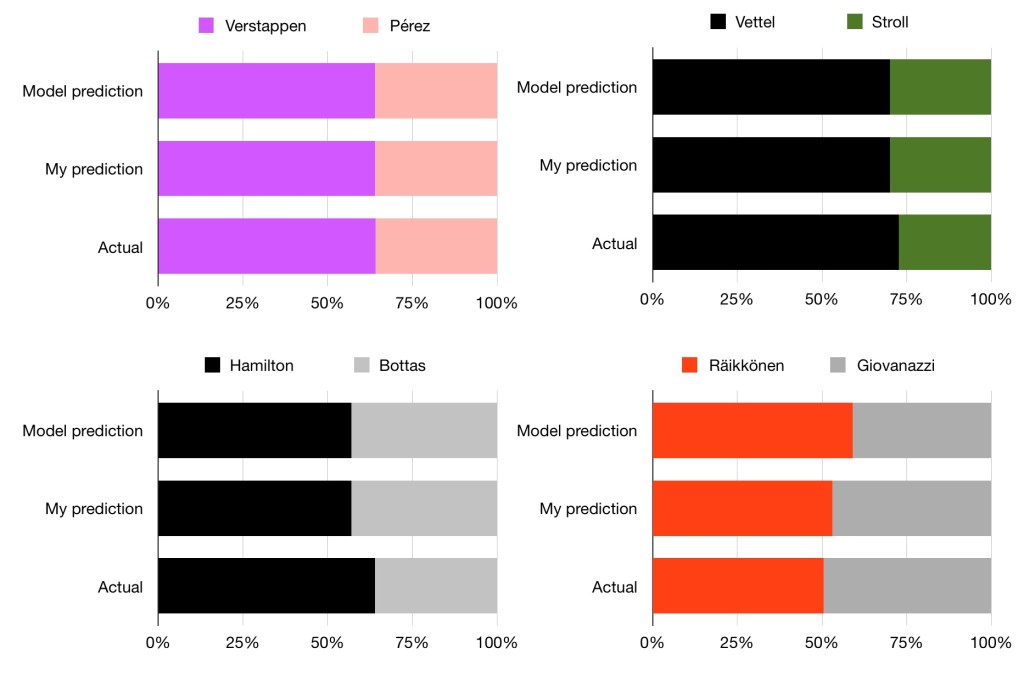 Red Bull and Aston Martin, Mercedes and Alfa Romeo all being pretty close to the mark too. The remaining 4 have significant differences, with Norris, Ocon, Sainz and Latifi all performing better than expectations. In the case of the first 3, this is partly due to the model not taking age or experience into account at the beginning of the year. In all 3 cases I adjusted the model’s predictions for my own predictions, which moved things in the right direction, but not by enough.