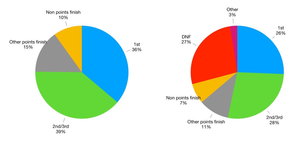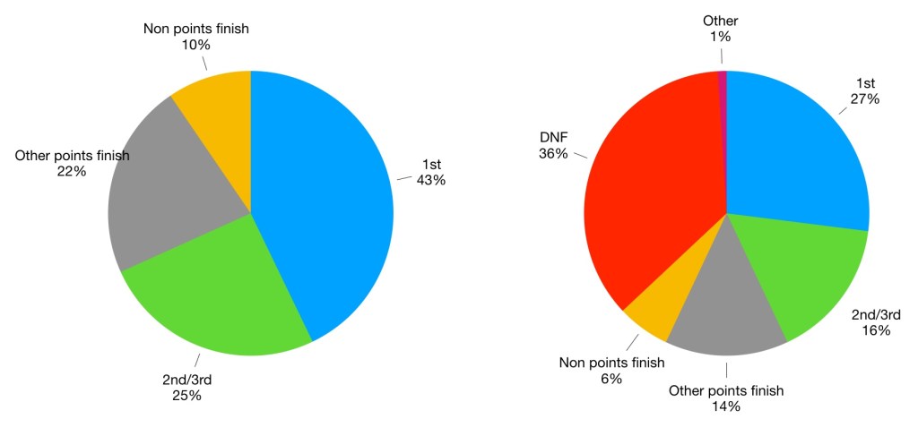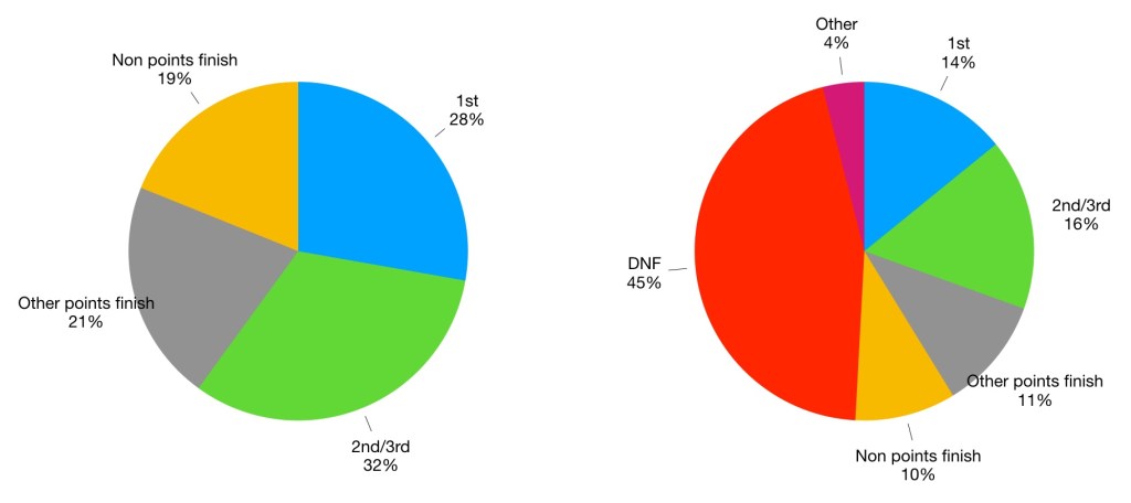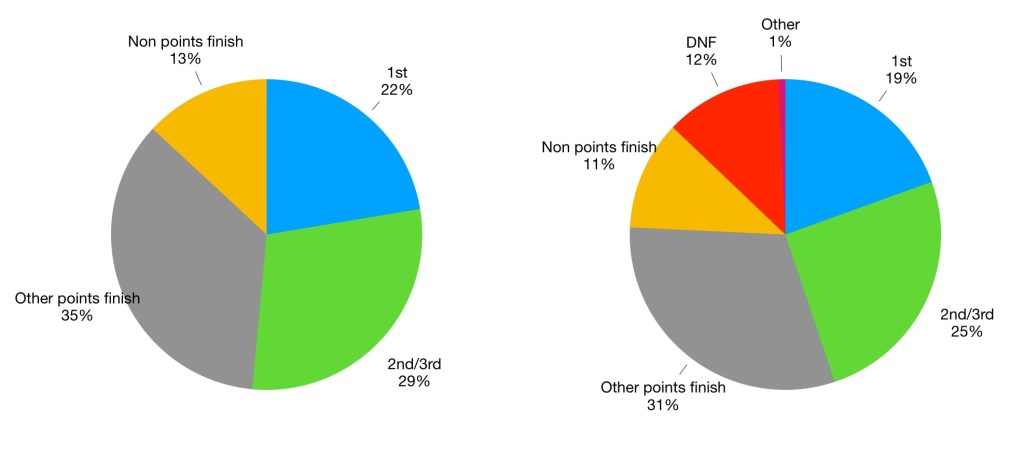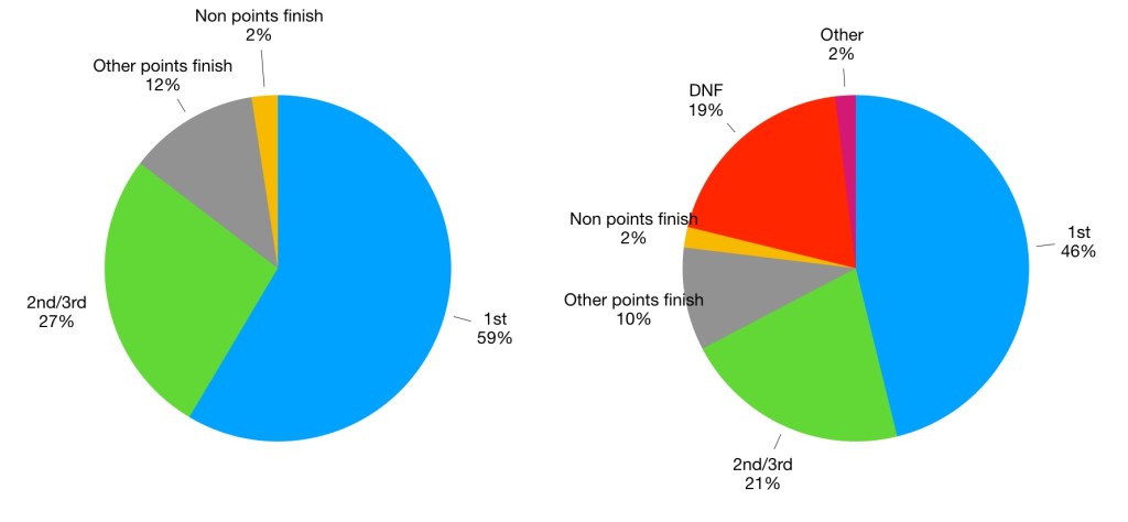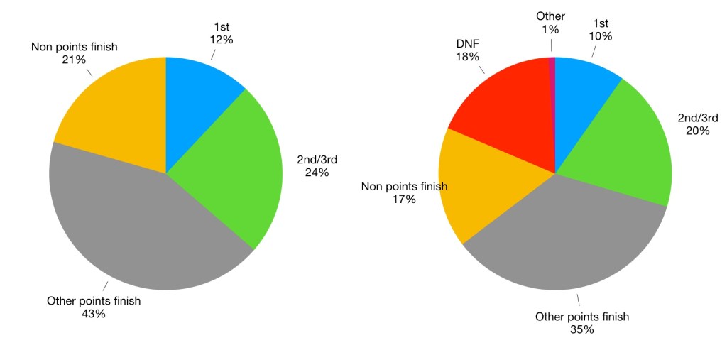 Points finishes are from the time of the race (so a 9th place finish would count today, but wouldn’t for most of F1 history). “Other” includes disqualifications, races where the driver didn’t start or withdrew. Although there is some discussion and comparison of stats between drivers below, the drivers span the entire history of F1, with different rules and circumstances across different careers.