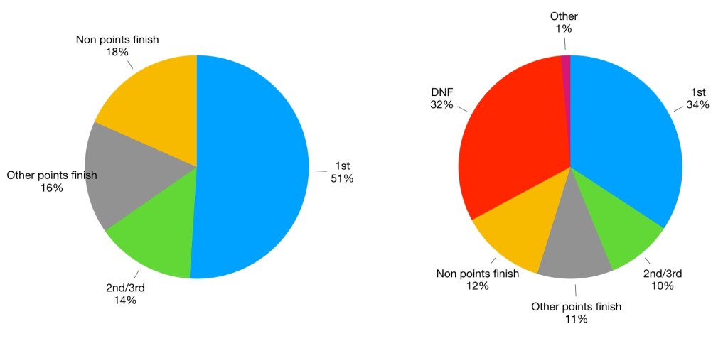 Lauda has a higher DNF rate than any other driver on this list, with his 1980s comeback being particularly bad. He failed to finish 6 of the first 9 races in his championship winning 1984 season, and reliability the following year was even worse! Even accounting for reliability his win rate is one of the lowest here, although of course it’s still exceptional compared to almost any other F1 driver.