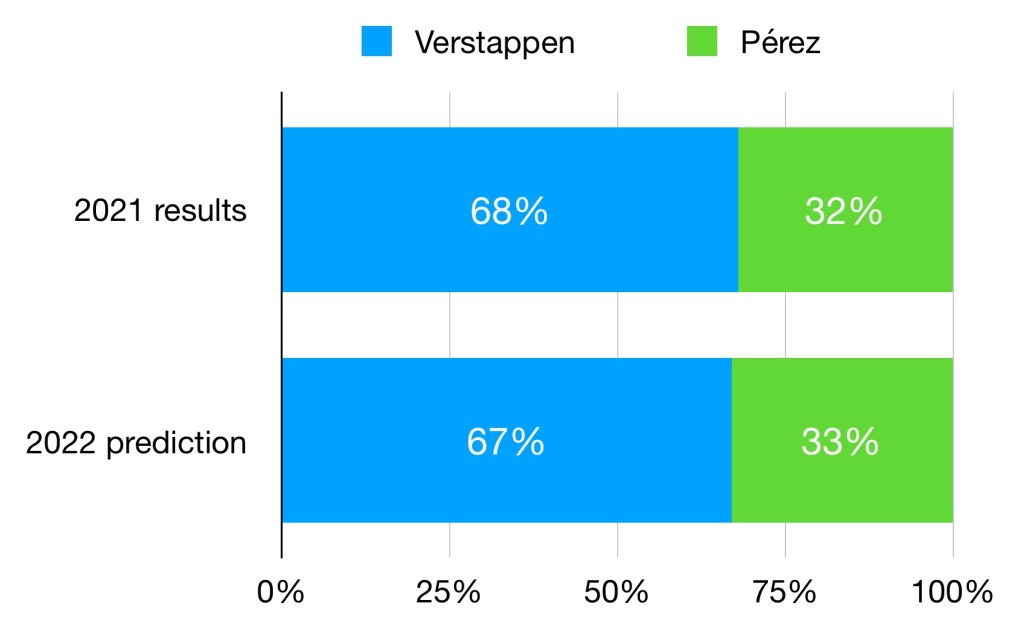 Obviously Verstappen it predicted to outscore Pérez again. Perhaps the only surprise is that the predicted percentage is so similar to last year, in what was considered an exceptional season. Max’s rating has gone sky high, so a slight redress this year is quite possible, particularly is Pérez can find the form that made him such a competitive midfield performer.