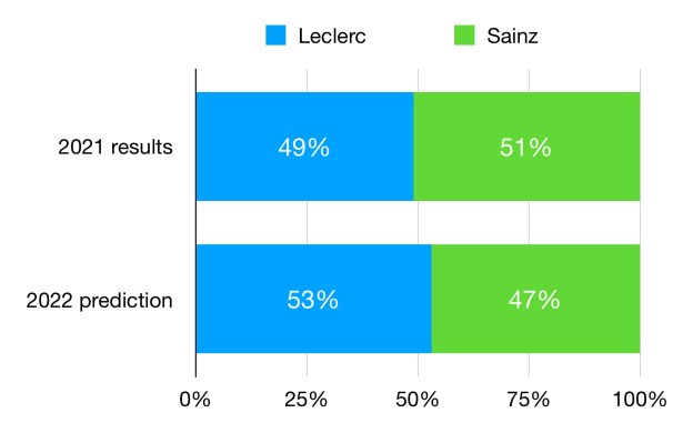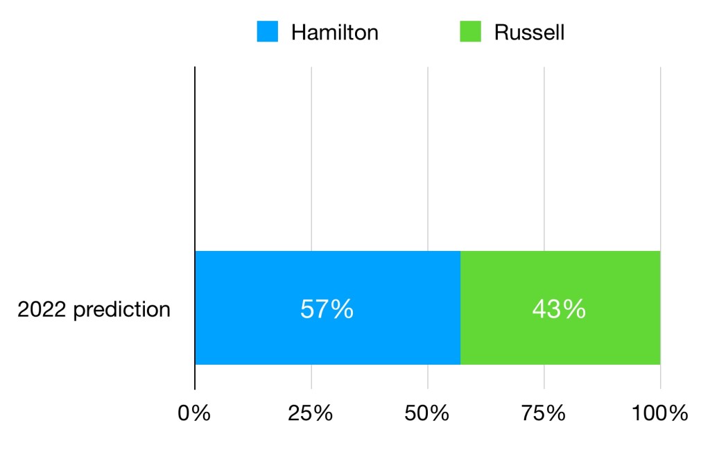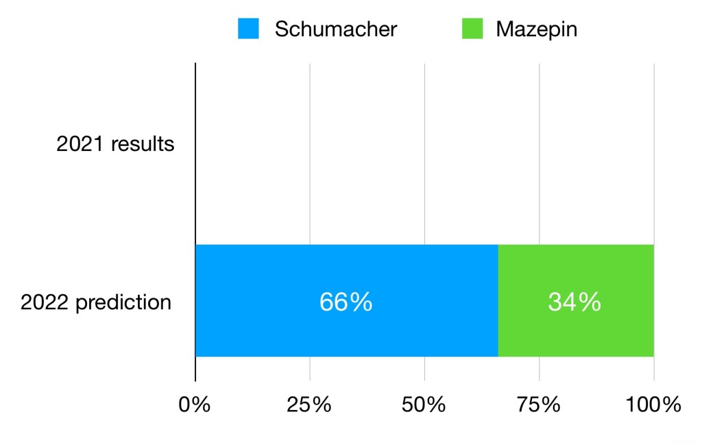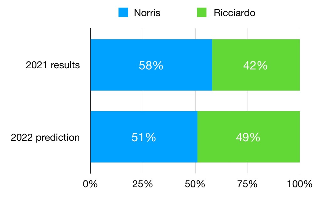 This is the most one-sided predicted match-up, despite Tsunoda being predicted to close the gap a bit in his second year. The extra 7% given to Yuki is perhaps not as small as it seems, and would translate to him scoring 34% more points in 2022 of Gasly’s results were the same. Given that Yuki seemed to make progress at the end of 2021, it’s quite possible that the actual results are closer than the predictions here. Certainly Red Bull would expect more from him in his second year, as he’s been rehired due to his future potential rather than his generally poor 2021 results.