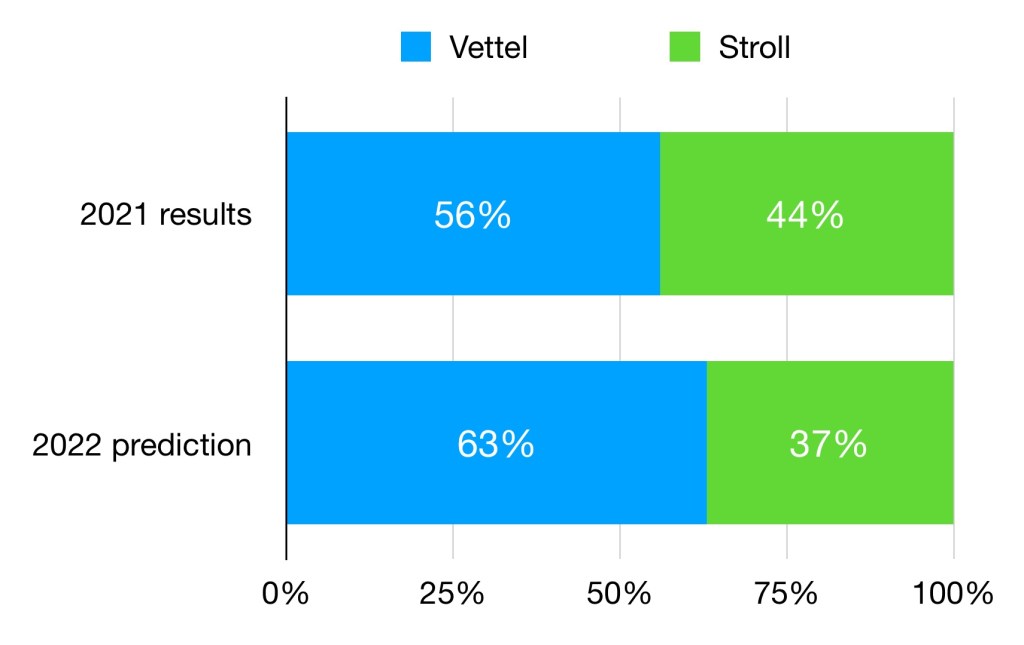 Vettel had some impressive races in 2021, but the model expected him to net more points. Giving him his Hungary podium back would mean he hit expectations almost exactly relative to Stroll, and the 2022 prediction expects a repeat of the relative form.