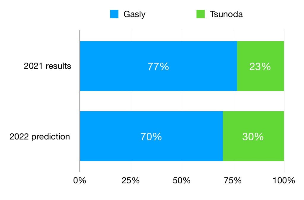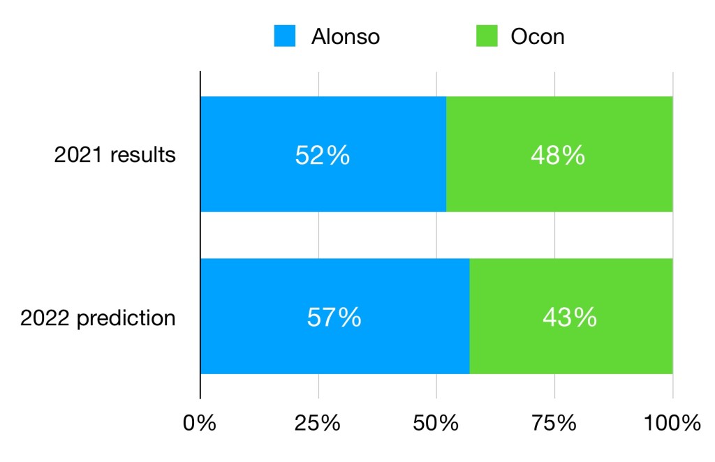 A much closer battle than in 2021 is predicted at McLaren. There’s no doubt that Ricciardo underperformed at times last year, even if he was the one to snatch a win, whilst Norris’ showed he could perform at an elite level. The delicate balance between these two realities will determine who comes out on top in 2022, with result currently being too close to call.