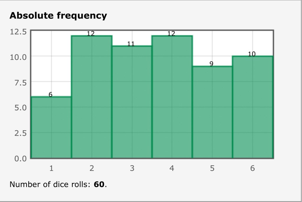 For example, if you roll a dice 6 times, it’s actually pretty unlikely that you will get each number once. You can try dice rolling here. It’s a good resource to show what random distributions look like. Here is a graph I obtained from the above link, using 60 dice rolls. I should stress that this was my first attempt, so there was no gaming of the system.