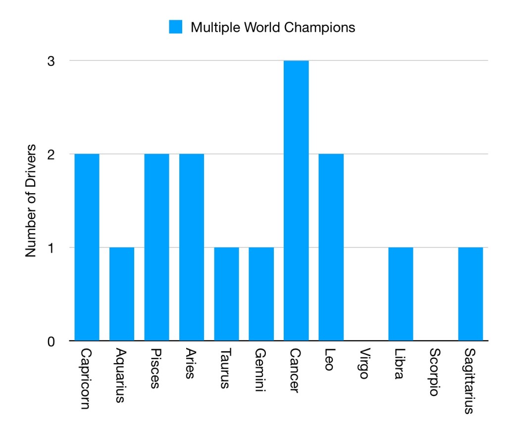 Whilst the two most successful drivers are Capricorn, no other multiple world champions are. Meanwhile, Cancer is now the most popular sign, with 3 drivers (Vettel, Ascari and Fangio).