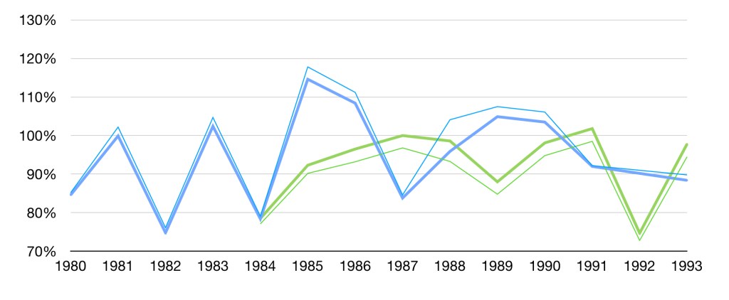 Under this system, the 2 rivals are considered to be practically identical. The biggest change from the original methodology is in 1988, which has a significant shift for both drivers. Which system is “better” is up for debate, but the comparison serves as a quick look at how something set up to be unbiased can still tend towards one result or another depending on subtle changes.