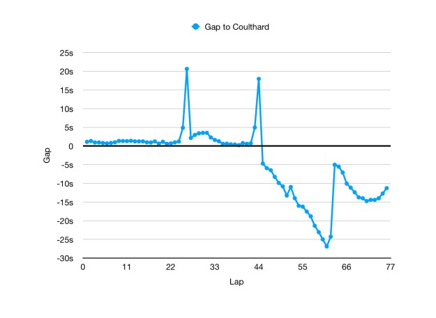 One peculiarity is that his fastest times come at the end of the stint. On the face of it this is not surprising (given his low fuel at this point). However, those extra few tenths he was trying to find were not really necessary given he already had enough of a gap.