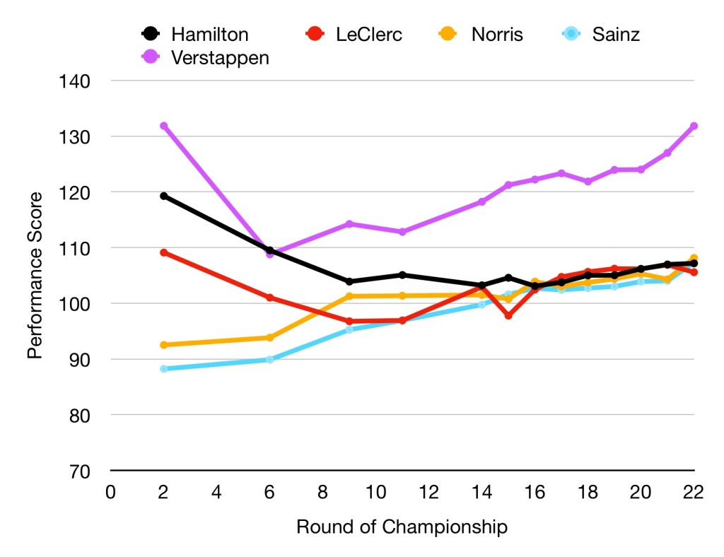 The hierarchy of F1 drivers is ever evolving, but Sainz demonstrated this season that he is good enough to fight with the best. The season long battle with Leclerc was fascinating to watch, and a timely reminder that rivalries do not have to spill over into regular collisions and bitter words. Although he’s still waiting for his first victory, his reputation as a points accumulator is as secure as ever, and he recently earnt the dubious honour of being the highest scoring driver ever without a win. Should he continue with this form for Ferrari he’ll surely break his duck sooner or later. The general suspicion among many F1 pundits (and seemingly Ferrari themselves) is that Leclerc will still be the number one driver if and when the car comes together, and the model agrees with this assessment, even as Sainz’s rating rose throughout the year. The message from 2021 is clear though: Carlos Sainz should not be underestimated.