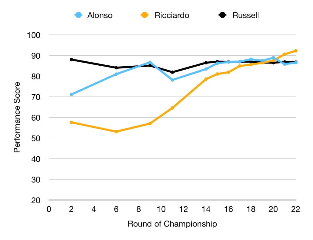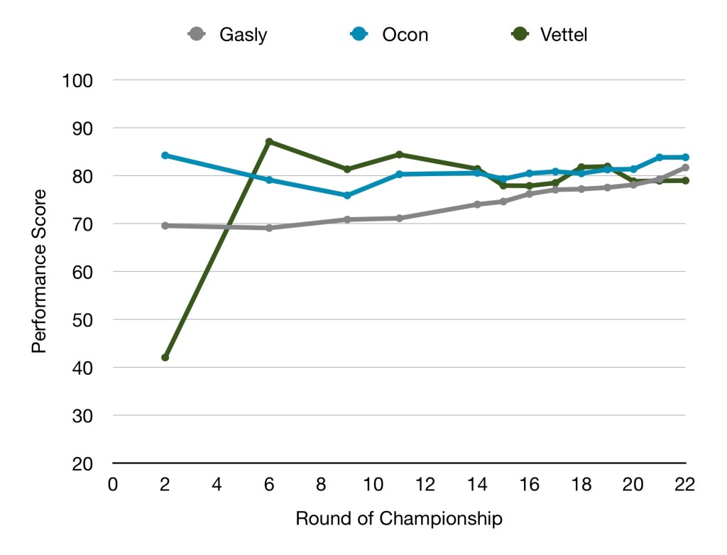 There are some pros and cons to this approach. One big advantage is that there’s no chance of favouritism. It also doesn’t suffer from recency bias , with each GP being valued the same. On the other hand, only focusing on race results can oversimplify things, with a lack of nuance in how results were obtained. For this reason the results should not be considered to be absolutely definitive, and where appropriate I have provided some context to the ratings. A good way of thinking about the rankings is that they are measuring how impressive a driver’s results are, given their machinery. This is subtlety different from ranking how good each driver has been, although obviously there’s a high degree of correlation between the two.