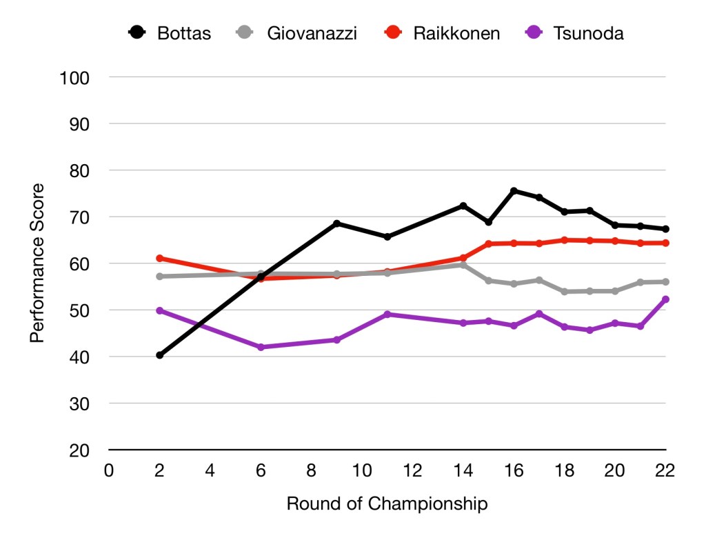Kimi’s final year can be considered a success given that he easily outscored his teammate despite missing 2 races. He was much closer to teammate Giovinazzi than the 10-3 score in his favour suggests, with a pair of 8th places elevating his standings considerably. The model partially corrects for his by giving credit for non-points finishes, as well as accounting for the ease in which a driver can rack up a high percentage of a. teams points in an uncompetitive car. Whilst Kimi failed to go out on a high in Abu Dhabi, his performances over the year were perfectly respectable.