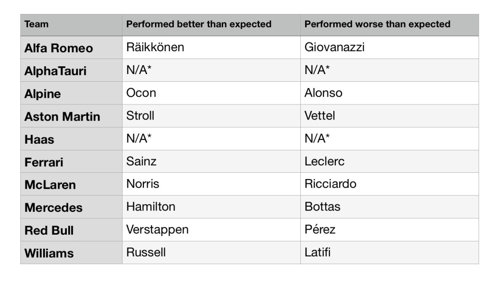 Just a reminder, the only thing that matters here in points (or finishing position), If one driver is considered to overdeliver, their teammate is considered to underdeliver, because the assessment is only made relative to their teammate, assuming 1 teammate throughout the year. Most of these results are probably expected given the 2021 season. If your favourite driver has performed worse than expected, it doesn’t necessarily mean that they’ve done a bad job (3 of the underperforming drivers are in the top 8 of driver rankings), it just means that the model expected their results relative to their teammate to be stronger given their previous F1 careers.