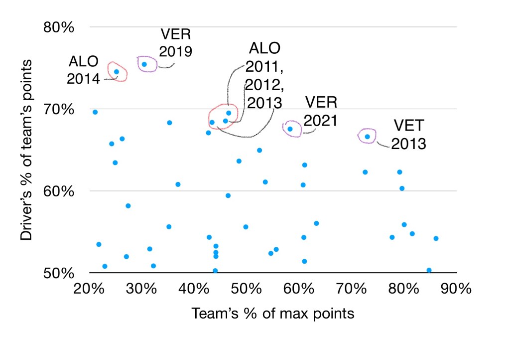 The graph above shows how many points the constructor scored (as a %, x-axis) against what percentage of those were scored by the lead driver (y-axis) since 2010. The higher up the y-axis, the more dominant the teammate battle, but we can also see that a large discrepancy is more likely if the team scores fewer points as a whole. There are 14 occasions where teams have scored more (as a % of points available) than Red Bull in 2021, but of those only Vettel’s 2013 performance comes close to Verstappen’s level of domination. The most dominant teammate performances (in at least semi-competitive cars) are highlighted, with VER 2021 being comparable to anything anyone else achieved. The difference is that Pérez is considered to be a significantly stronger teammate overall than Massa or Webber. Räikkönen is considered to be a similar level to Pérez, which leads to the conclusion that Verstappen’s 2021 performance is comparable to Alonso’s in 2014.