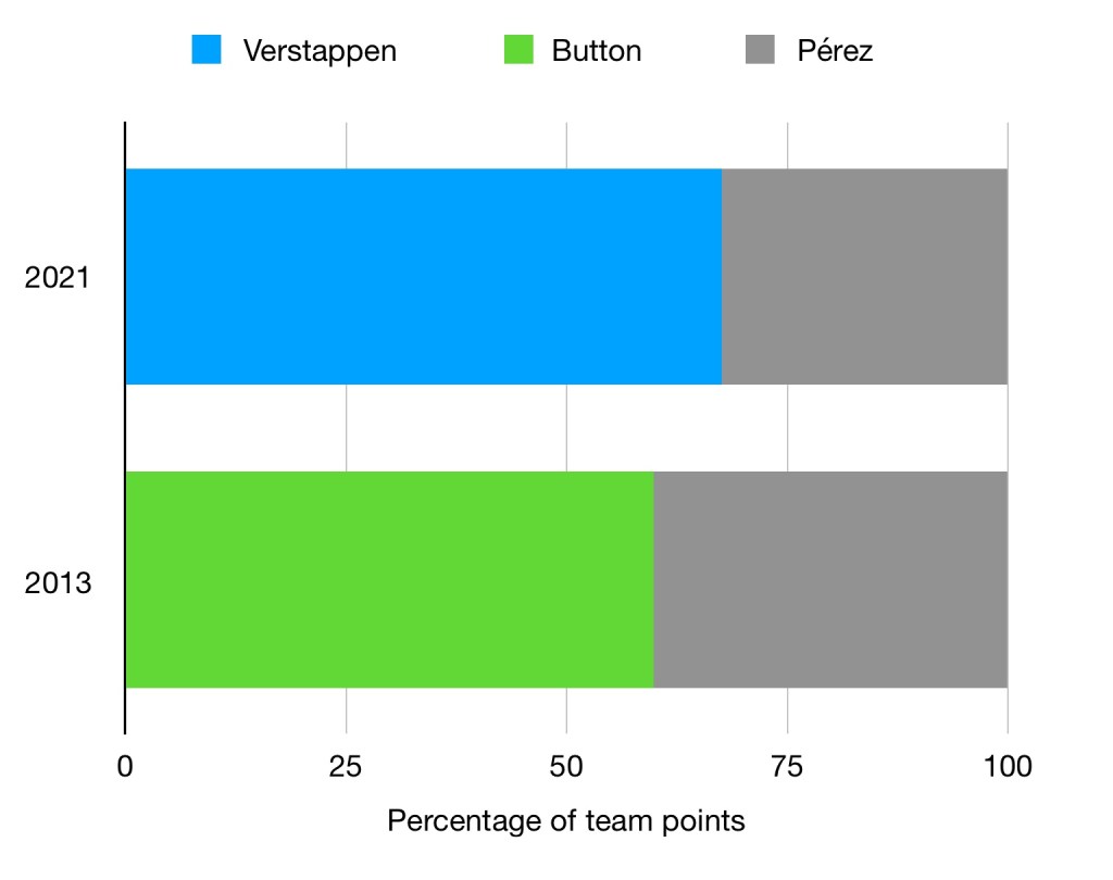 Verstappen’s slice of the points is significantly higher than Button’s. The model thinks this is partly due to Verstappen being a fundamentally superior driver, but also due to an above average performance during the year (and a relatively weak performance from Pérez). It should also be noted that such a high percentage of points in 2021 is unusual (although not unprecedented) given the competitiveness of the car.